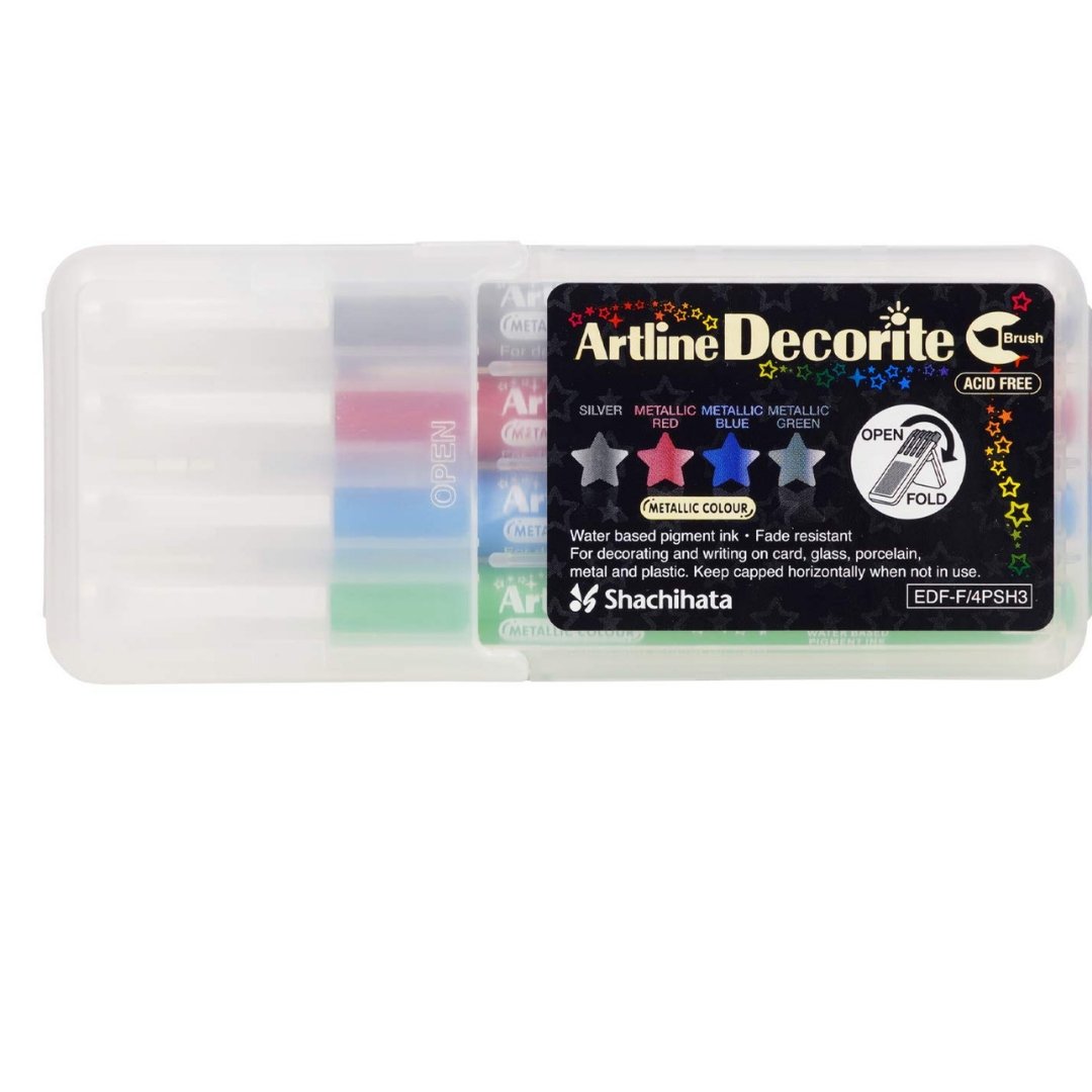 - Artline Decorite Metallic Pearl Brush Markers are perfect for decorating and writing on various surfaces like cards, glass, porcelain, metal, and plastic.