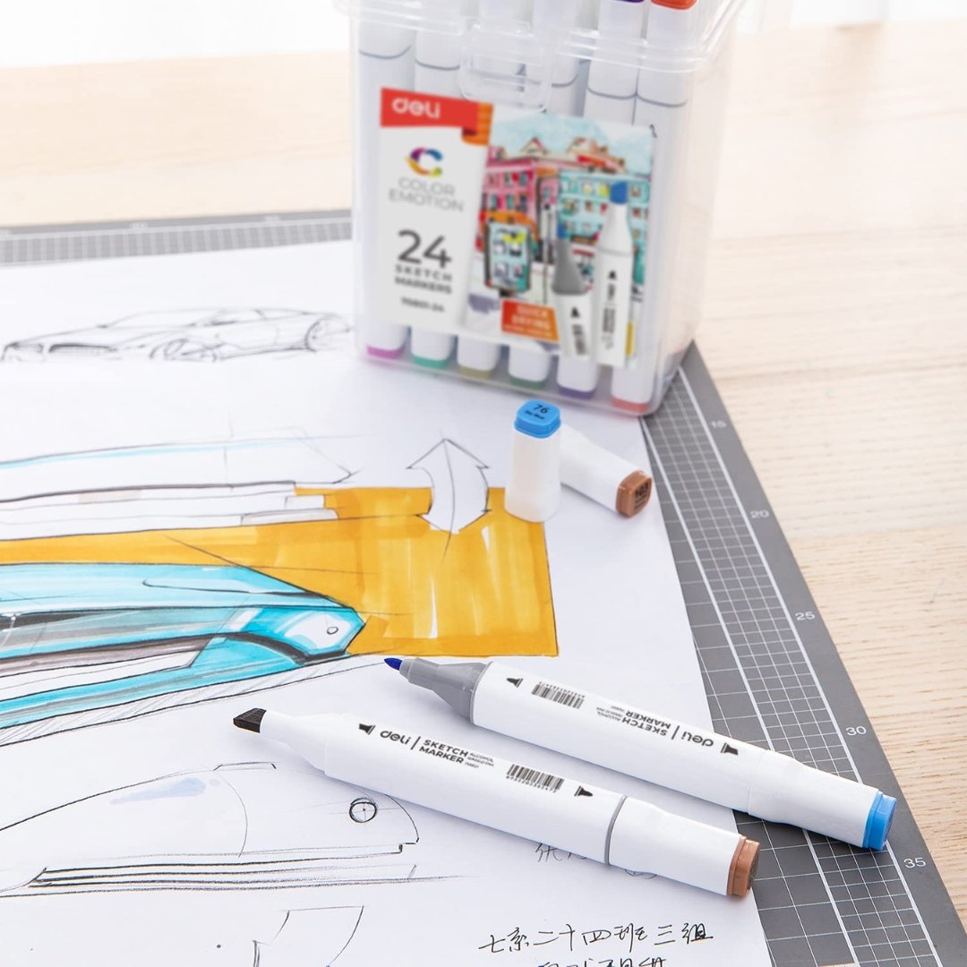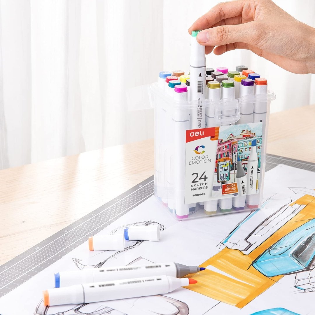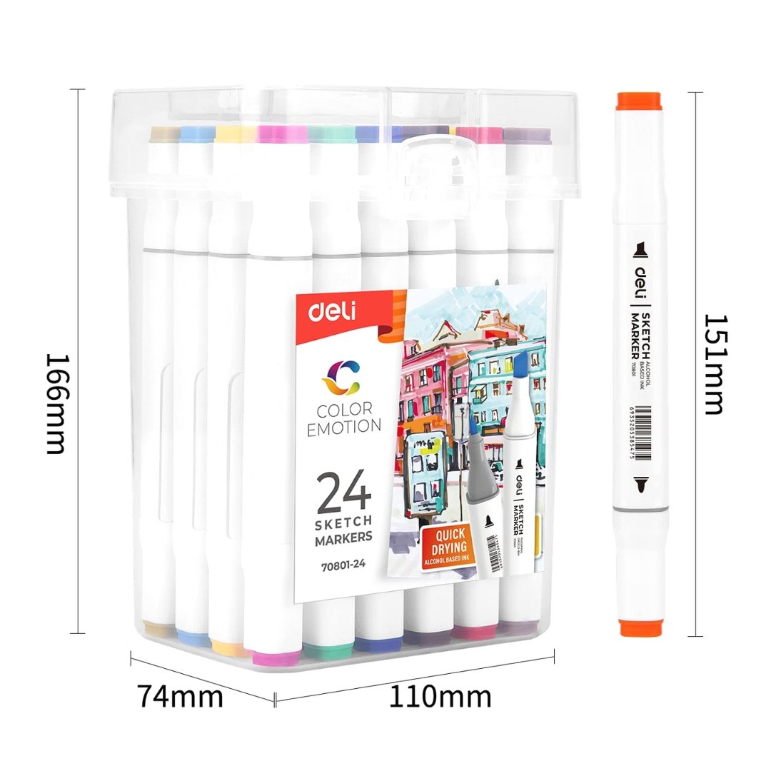 - DELI 24 Sketch Marker, Widen your artistic horizons with the dual-tip marker design! Choose the brush tip for sweeping, calligraphic strokes or quickly color in large areas with the wide chisel tip.