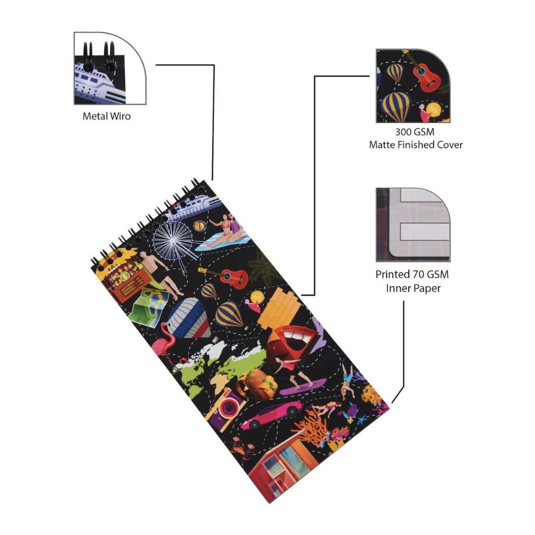 - 8 x 4 inches, 80 printed pages, ruled, metal wireo, and a 300 GSM matte laminated cover are the features that matter.