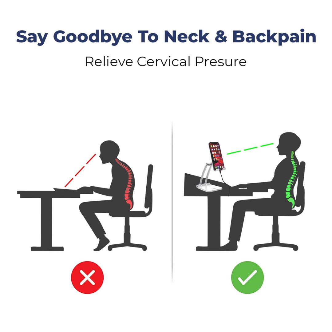 - The adjustable stand has been carefully designed, which corrects posture, protects the cervical spine, improves kyphosis. charging hole design makes this smartphone and tablet stand convenient for charging while using, which helps work, study, Zoom Calls/Video Calls